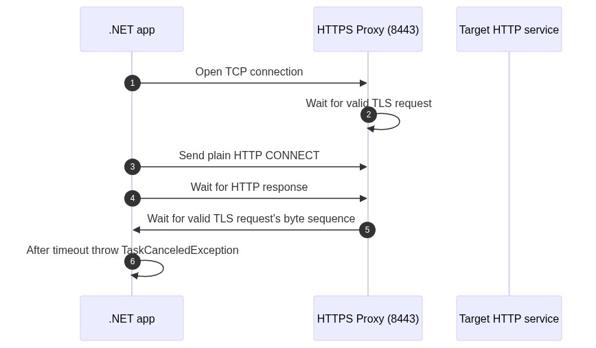 await Socket.ConnectAsyncin the .NET application connected successfully to the proxy. - The proxy did not record any incoming requests when using