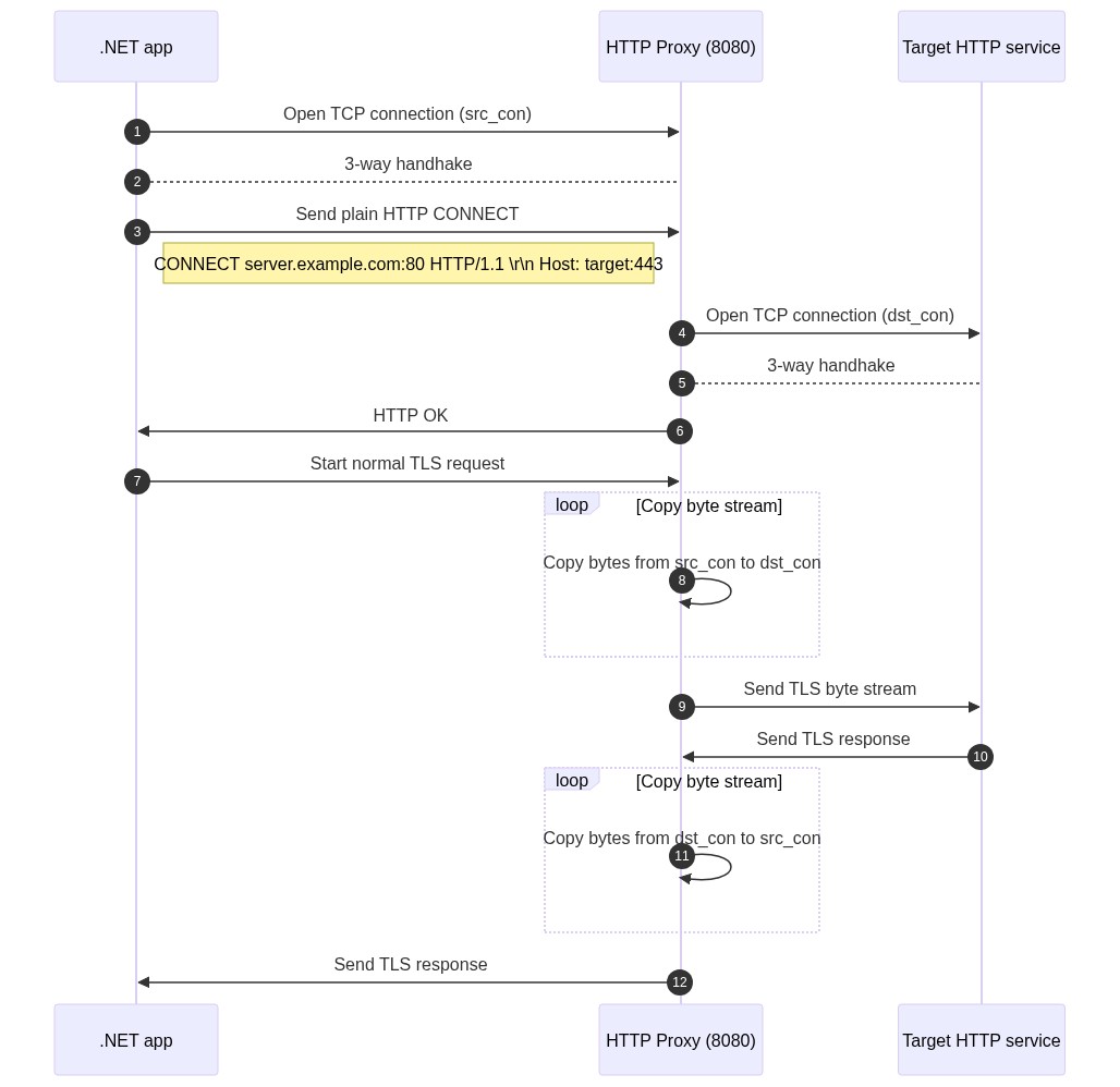 Instead of using the HTTPS/8443 proxy, we simply switched to the HTTP/8080 proxy alternative. This sequence diagram is showing the packet flow between our application, the HTTP proxy server and the target endpoint: